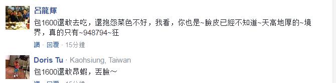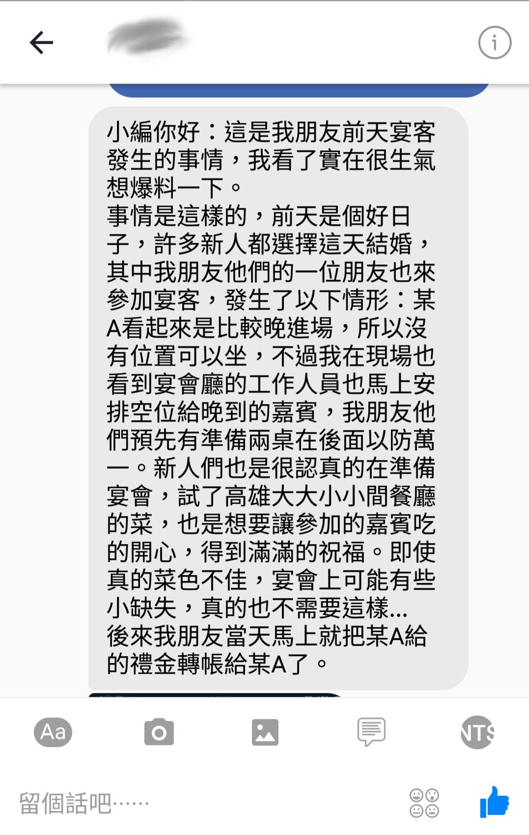 之后,有網(wǎng)友在網(wǎng)上替新郎抱屈,文中提到,明明是某A比較晚進(jìn)場才會沒位子坐,而“宴會廳的工作人員也馬上安排空位給晚到的嘉賓了”,接著還為菜色“平反”,“新人們也是很認(rèn)真的在準(zhǔn)備宴會!試了高雄大大小小間餐廳的菜。即使真的菜色不佳,也不需要這樣說吧”。