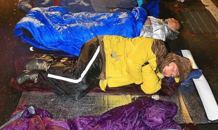 在禁食行動(dòng)實(shí)施超過24小時(shí)后,6日晚間6時(shí)50分“時(shí)代力量”五位“立委”又利用雷射投影器材將熒光綠色的“退回勞基法”五個(gè)字投影到蔡辦外墻上,宣示反對(duì)勞基法再修法的決心;不久后這出“小綠”尬“大綠”的戲就到了高潮的一幕——7日凌晨約0點(diǎn)10分,因不滿第二頂帳篷遭警方強(qiáng)行拆除并“代為保管”,“時(shí)代力量”的黃國昌與徐永明等5名“立委”憤而直接躺在雨中睡覺!