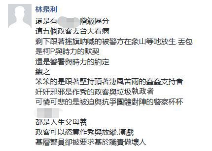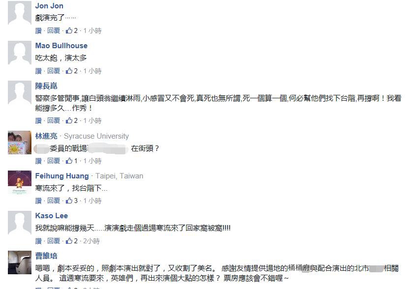 據(jù)臺(tái)灣《中時(shí)電子報(bào)》報(bào)道,黃國昌稍早時(shí)還在臉譜網(wǎng)(facebook)表示,“很久很久沒有如此難過”,不是因?yàn)槿頋窭、不是因(yàn)槌^40小時(shí)未進(jìn)食、而是因?yàn)楸緛硪詾?016改變已經(jīng)發(fā)生,“沒有想到我所熱愛的臺(tái)灣權(quán)柄的濫用,竟然依舊如此冷酷”;而當(dāng)警方不斷柔性勸導(dǎo)其早點(diǎn)“離開休息”時(shí),他又反唇相譏“你不要再演戲了”!