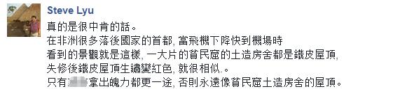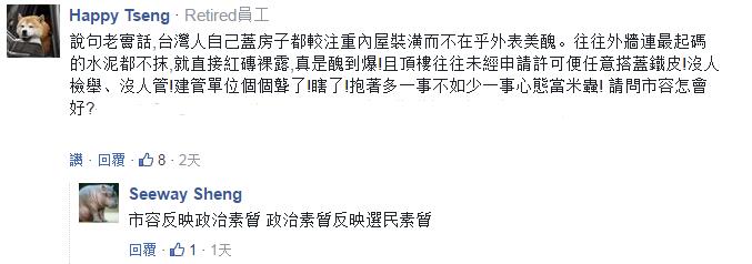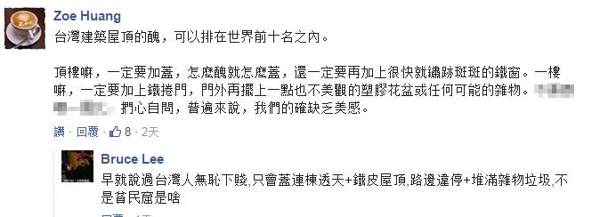 反之,一些臺(tái)灣小伙伴倒覺得這樣的評(píng)價(jià)很“中肯”,其中最為人詬病的當(dāng)屬違建不斷的鐵皮屋頂,“非洲很多落后地區(qū)就是這樣的景象,一大片的貧民窟都是鐵皮屋頂”、“頂樓都是未經(jīng)許可便可隨意搭蓋的鐵皮,監(jiān)管部門都睜一只眼閉一只眼”、“市容反映政治素質(zhì),政治素質(zhì)反應(yīng)選民素質(zhì)”。