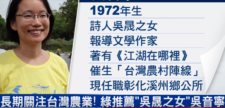 臺媒報(bào)道,吳音寧過去曾遁入墨西哥叢林生活,也曾寫書探討臺灣農(nóng)業(yè)問題,當(dāng)時(shí)以為寫作會是她人生的志業(yè)。沒想到的是,表哥黃盛祿選上彰化溪州鄉(xiāng)長,缺個(gè)幫手;吳音寧不顧父親吳晟的反對,決心幫忙,成了鄉(xiāng)公所主任秘書。