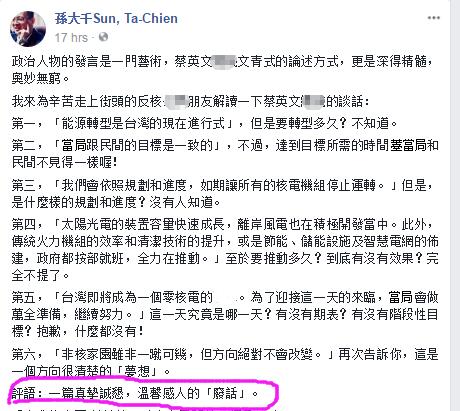 孫大千在文章中不僅逐一反駁了蔡英文發(fā)帖的內(nèi)容,更直言,蔡英文口中的“非核家園”方向絕不會(huì)改變,只是再次告訴大家“這是一個(gè)方向很清楚的‘夢(mèng)想’”。