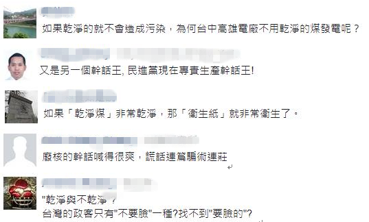 面對外界的批評和質(zhì)疑,臺“行政院”發(fā)言人徐國勇18日接受媒體訪問時表示,燃煤仍然是現(xiàn)階段其他國家和地區(qū)采用的發(fā)電方式,并強調(diào)真的有干凈的煤,不是賴清德發(fā)明的名詞,建議大家google一下。現(xiàn)在高質(zhì)量的煤,如無煙煤,經(jīng)過技術(shù)去化污染,排放污染量可比燃氣發(fā)電。他還指出, 臺灣不能說不要這些電廠、不要這些機組,可是又要用電,這是相當矛盾的。