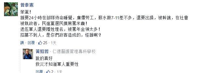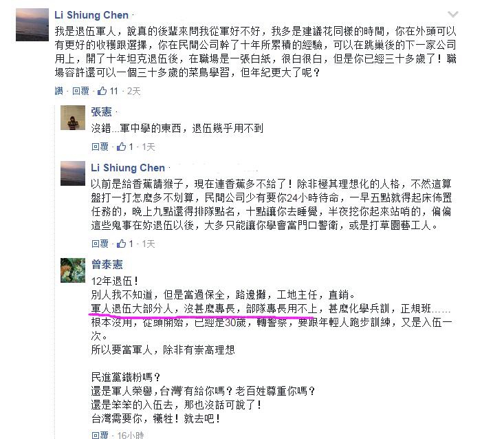 此外,網(wǎng)友也有退役的官兵po出真實經(jīng)歷,表示“軍中學(xué)的東西退伍后幾乎用不到”、“在職場是一張白紙”、“是一個30多歲的菜鳥”……暗指退役后的福祉全然未被執(zhí)政者照顧到。