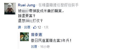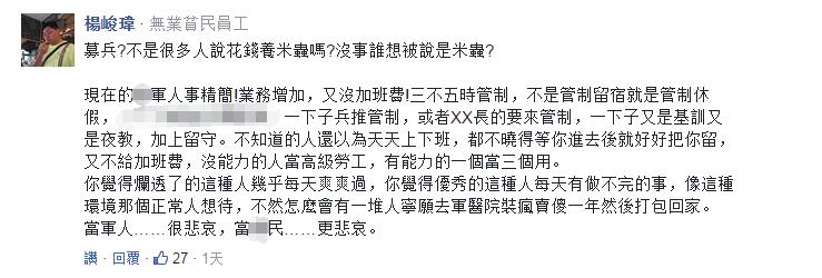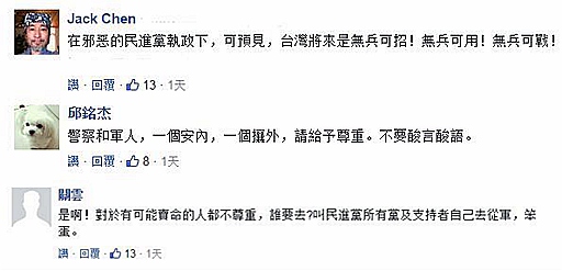 字里行間透出的無奈與無助令不少網(wǎng)友唏噓的同時,也把劍鋒指向了對軍人“召之即來揮之即去”的蔡英文當(dāng)局:有人可憐臺灣軍人成了“臺灣政治斗爭下的炮灰”;有人虧民進黨“說花錢養(yǎng)軍人是養(yǎng)米蟲,現(xiàn)在招不到人怪誰”;還有人感嘆“在邪惡的民進黨執(zhí)政下,臺灣的將來就是無兵可用”……