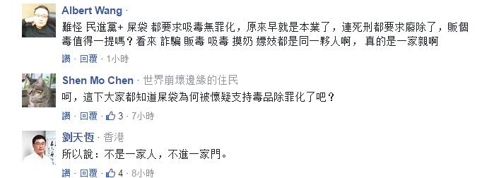 還有網(wǎng)友驚覺道“難怪屎袋(注:島內(nèi)網(wǎng)友對“時代力量”的“愛稱”)會支持民進黨的‘毒品除罪化’主張”、“不是一家人不進一家門啊”。