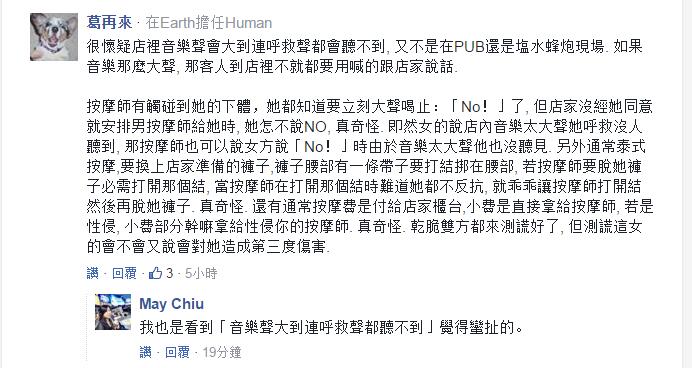 “他直接把我褲子脫掉就性侵我”,身為被害人的臺(tái)女在接受臺(tái)灣《東森新聞》訪問(wèn)卻表示,她被按摩到一半就慘遭性侵,且店內(nèi)音樂(lè)大聲,她的呼救完全沒(méi)人知道,還稱(chēng)付錢(qián)給小費(fèi)只是單純想快點(diǎn)離開(kāi),“(他說(shuō))我給他小費(fèi),是因?yàn)槲覞M(mǎn)意他服務(wù),這我不能接受”。