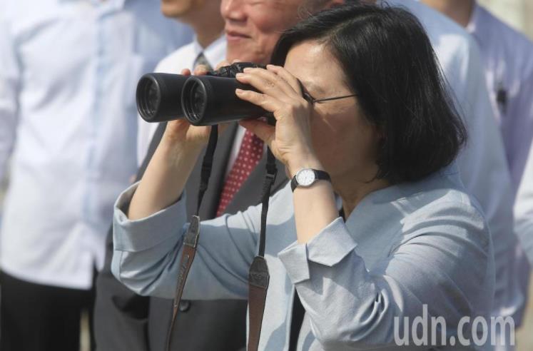 蔡英文到苗栗縣用望遠(yuǎn)鏡眺望,視察離岸風(fēng)力發(fā)電機(jī)。(圖片來源:臺灣《聯(lián)合報》)