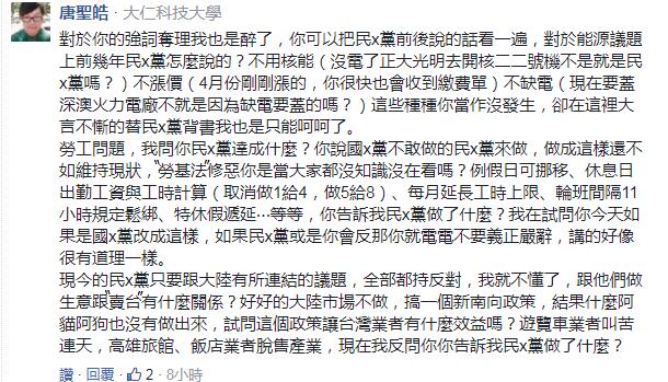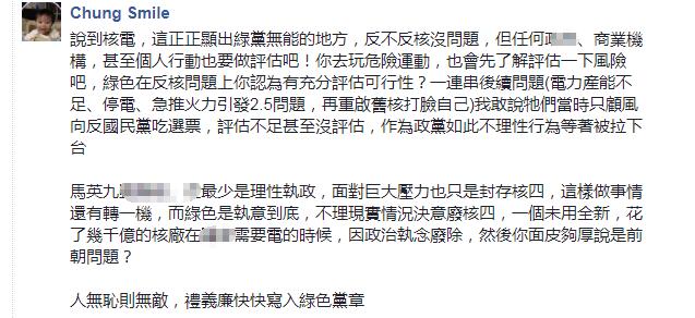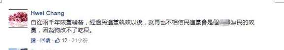 據(jù)臺灣《中時電子報》報道,有網(wǎng)友指出,他“有投蔡英文,結(jié)果似乎很快就后悔了”,原因在以下幾點:首先,民進黨不僅各種撕毀選前的反核承諾,還用破壞生態(tài)的方式大量搜刮土地來建風力與太陽能電廠,而遇到全臺大停電時,賴清德竟也對電價調(diào)漲不諱言;第二,對勞工的承諾也是“0項達成”;第三,對“同志議題”的退縮;第四,對外要大家團結(jié)一致,但內(nèi)部卻用“臺灣價值”去試圖清算他人,但每個喊“臺灣價值”的人說出來的定義卻都完全不一樣;不僅如此,現(xiàn)在還要將黨政軍的手重新伸入大學迫害大學自治!