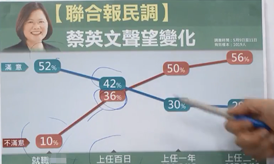 可以看到蔡英文剛剛就職的時(shí)候,滿意度高達(dá)52%哦,不滿意度只有10%,詐騙集團(tuán)戰(zhàn)績(jī)超神。而上任百天后,情況開始急劇變化,滿意度下滑到四成,不滿意度上升到接近四成。也就是說,僅僅花了三個(gè)月的時(shí)間,臺(tái)灣民眾已經(jīng)嘗出來,這盤菜不對(duì)味!