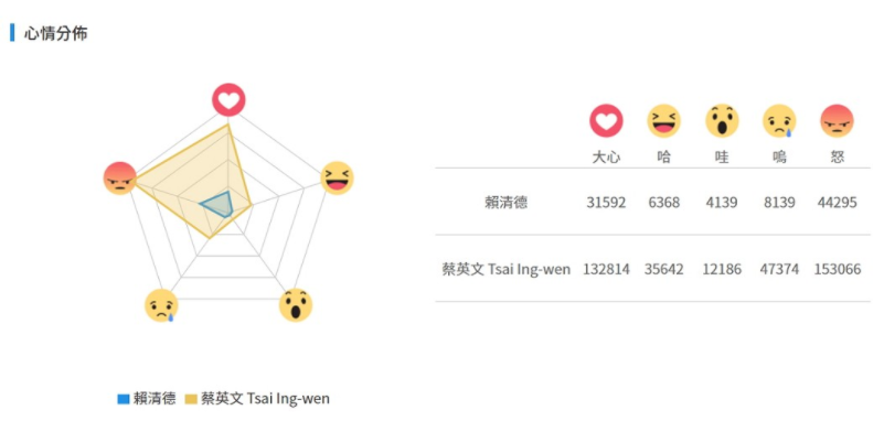 臺(tái)媒通過(guò)調(diào)查蔡英文、賴清德臉譜網(wǎng)發(fā)現(xiàn),這一年內(nèi)(20170510—20180510)跟進(jìn)兩人話題并給予按鈕回應(yīng)的網(wǎng)友當(dāng)中,排除按“贊”的人次,按下心情按鈕的人則以“怒”最多,接著才是愛(ài)心,表示對(duì)他們的言論感到不滿的人是極多數(shù)。