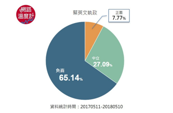 通過上圖我們不難看出,在最近一年時(shí)間里,網(wǎng)絡(luò)上只有7.77%的人對蔡英文執(zhí)政有正面評價(jià),其余部分,不滿意的評價(jià)高達(dá)65.14%。要是放在淘寶上,這樣的賣家可能早就倒閉了……