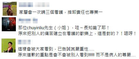 對此,網(wǎng)友們表示:“家屬會一次請三個看護,推卸責(zé)任也專業(yè)一點”“原來把別人的痛苦建立在看護的歡樂上,這是對的?!”“原來道歉的重點是會不會被人看到,而不是病人的尊嚴(yán)”。