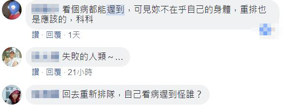 貼文曝光后,網(wǎng)友也紛紛留言表示:“看個病都能遲到,可見你不在乎自己的身體,重新排也是應(yīng)該的”、“失敗的人類”、“回去重新排隊,自己看病遲到怪誰?”