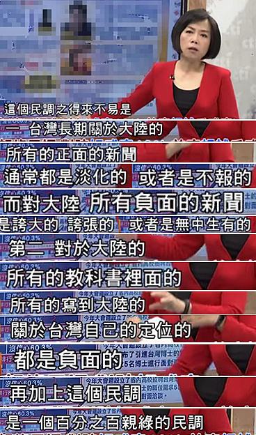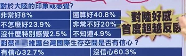 同一份親綠媒體的數(shù)據(jù)顯示,臺灣民眾對大陸的好感度“有史以來第一次”出現(xiàn)了正面評價,政論節(jié)目主持人黃智賢對此表示,這個100%親綠民調(diào)能有這樣的結(jié)果絕對是“來之不易”,黃暐瀚更激動地直言,這份好感度的排名也印證了那句話——還馬英九公道者必蔡英文!