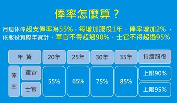 月退休俸起支俸率為55%,每增加服役1年,俸率增加2%,依服役實際年資計,軍官不得超過90%,士官不得超過95%。