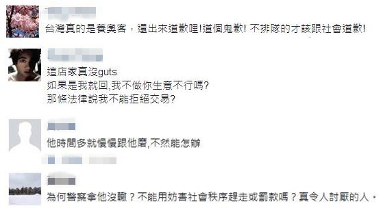貼文引爆網(wǎng)友怒火,“臺(tái)灣真的養(yǎng)奧客,還出來道歉!不排隊(duì)的人才該跟社會(huì)道歉”“如果是我就回,我不做你生意不行嗎?哪條法律說我不能拒絕交易?”“為何警察拿他沒轍?不能用妨害社會(huì)秩序趕走或罰款嗎”。