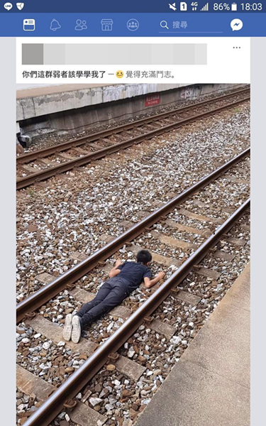 臉譜網(wǎng)“臺(tái)鐵家族”轉(zhuǎn)貼一則貼文,有男子疑似故意趴在鐵軌上,還拍照炫耀說“你們這群弱者該學(xué)學(xué)我了”。貼文一出,許多抨擊留言一一出現(xiàn),有網(wǎng)友表示震驚,直說“想死也不要趴在鐵軌上!”,也有網(wǎng)友不以為然,表示“屁孩不意外”“暑假到了屁孩很多”,還有網(wǎng)友說“撞死算了”。