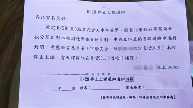 29日,臺灣地區(qū)領導人蔡英文出席“三軍六校聯(lián)合畢業(yè)典禮”,鄰近的文化小學一度被迫停課,一名家長在臉譜網曝出《停課通知單》,并發(fā)文抱怨道:“真的假的公文?‘三軍六校畢業(yè)典禮’是什么大事,到底哪位天王要去,搞到如此這般大規(guī)模管制,連小學生都停課,要不要頒布戒嚴令?”