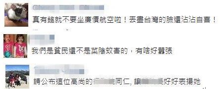大票網友看到該名大媽在日本機場撒野,紛紛留言痛罵:“真有錢就不要坐廉價航空啦!丟盡臺灣的臉還沾沾自喜”“我們是貧民還不是蔡英文害的,有啥好囂張”“請公布這位高尚的‘行政院’同仁,讓‘賴院長’好好表揚她”。