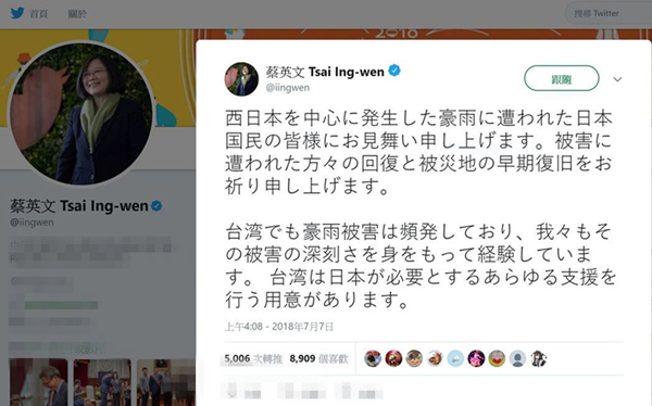 日本西部和中部連日暴雨成災(zāi),引發(fā)河流泛濫和泥石流,截至當(dāng)?shù)貢r(shí)間8日晚10時(shí),死亡人數(shù)上升至85人,并有近百人失蹤,上千人等待救援。對(duì)此,臺(tái)灣當(dāng)局領(lǐng)導(dǎo)人蔡英文7月7日特地用日文發(fā)推特表示愿協(xié)助日本。她說(shuō):“對(duì)日本遭受嚴(yán)重暴雨的人民致上慰問之意,也祈福受災(zāi)地區(qū)和人民能早日回復(fù)。臺(tái)灣也常受到暴雨的侵襲,深刻體會(huì)暴雨成災(zāi)的嚴(yán)重性,臺(tái)灣已做好準(zhǔn)備,必要時(shí)可提供日本支持!