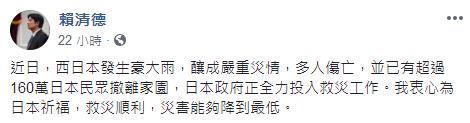 繼蔡英文表示愿協(xié)助日本后,臺(tái)當(dāng)局“行政院長(zhǎng)”賴清德也于臉譜網(wǎng)PO文表示,“近日,西日本發(fā)生豪大雨,釀成嚴(yán)重災(zāi)情,多人傷亡,并已有超過(guò)160萬(wàn)日本民眾撤離家園,日本政府正全力投入救災(zāi)工作。我衷心為日本祈福,救災(zāi)順利,災(zāi)害能夠降到最低!