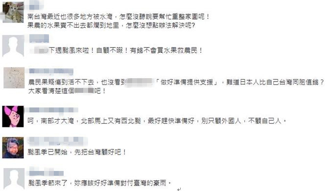 對(duì)于蔡英文要提供日本援助的說(shuō)法,臺(tái)灣網(wǎng)友痛批:“南臺(tái)灣最近也很多地方被水淹,怎么沒聽說(shuō)要幫忙重整家園呢”“下周臺(tái)風(fēng)來(lái)啦,自顧不暇,有錢不會(huì)買水果救農(nóng)民!”“農(nóng)民果賤傷到活不下去,也沒看到蔡當(dāng)局做好準(zhǔn)備提供支持,難道日本人比自己臺(tái)灣同胞值錢?”“臺(tái)風(fēng)季已開始,先把臺(tái)灣顧好吧”。