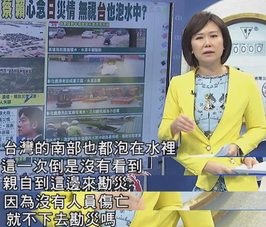 南臺(tái)灣受到暴雨侵襲一個(gè)星期,臺(tái)灣南部也都泡在水里,卻沒有看到蔡英文和賴清德南下勘災(zāi),主持人在節(jié)目中質(zhì)問:“難道因?yàn)闆]有人員傷亡就不下去勘災(zāi)嗎?”