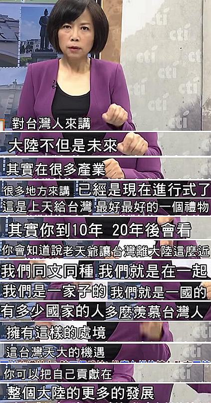 當現(xiàn)在越來越多的臺灣人意識到他們的未來與出路在大陸時,臺灣或許還有“救”。黃智賢對此就很喜聞樂見,她表示也許10年、20年后,臺灣人回頭看會發(fā)現(xiàn),能把自己貢獻在整個大陸的發(fā)展中,是上天給臺灣最好最好的禮物;黃智賢更強調,兩岸同文同種,“我們就是一國的,多少國家羨慕臺灣人擁有這樣的機遇”、“臺灣的未來一定在大陸”!