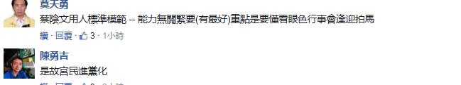 不少網(wǎng)友表示“這就是蔡英文的用人模范啊”、“故宮‘民進(jìn)黨化’了啊”……