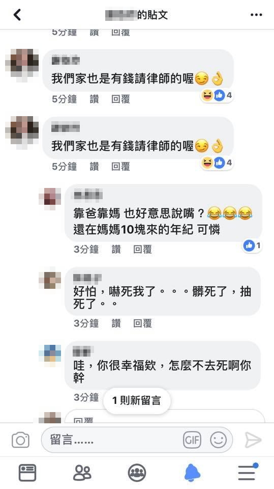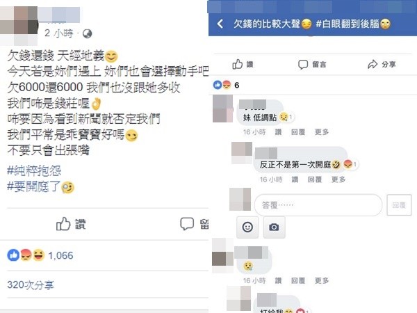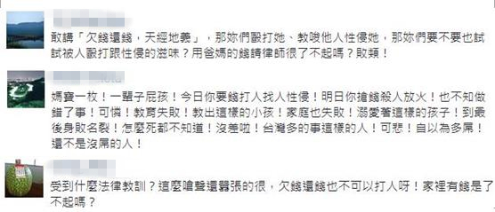 事后,其中一名霸凌女子在臉譜網(wǎng)貼文指出,欠錢還錢,天經(jīng)地義,今天若是你們遇上,你們也會(huì)選擇動(dòng)手吧,欠6000還6000,我們也沒跟她多收,我們不是錢莊喔,不要因?yàn)榭吹叫侣劸头穸ㄎ覀儯覀兤匠J枪詫殞毢脝,不要只?huì)出張嘴。貼文引來眾多網(wǎng)友圍剿,可是女子卻反嗆“我們家也是有錢請律師的喔!