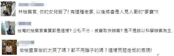 對(duì)此,臺(tái)灣網(wǎng)友紛紛表示:“有這種老爹,以后將會(huì)是人見人討厭的爹寶”“臺(tái)灣的檢察官素質(zhì)就這樣?公私不分,威脅取供辦案?”“做檢察官做得太爽了嗎?都不用腦子的嗎?這樣荒腔走板的表現(xiàn)”。