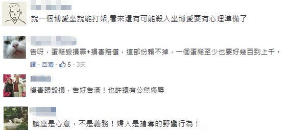 有的網(wǎng)友回復(fù)“傷害跟損毀,告好告滿!也許還有公然侮辱”,有的網(wǎng)友強(qiáng)調(diào)“讓座是心意,不是義務(wù)!婦人是搶奪的野蠻行為”,還有的網(wǎng)友甚至說:“就一個(gè)博愛座就能打架,看來還有可能殺人,坐博愛座要有心理準(zhǔn)備了”。