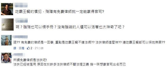 網(wǎng)友們紛紛替店家不平,稱“吃霸王餐的慣犯,殘障有免費(fèi)律師就一定贏官司?”也有人諷刺說“沒有腦袋的人還可以活著也太神奇了吧?”。