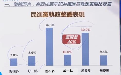 在臺(tái)灣競(jìng)爭(zhēng)力論壇30日公布的民調(diào)中,有高達(dá)64.1%的受訪者不滿意臺(tái)灣地區(qū)領(lǐng)導(dǎo)人蔡英文的執(zhí)政,相較今年2月所做的民調(diào),不滿意度又增加3.8%;且有4成民眾認(rèn)為民進(jìn)黨執(zhí)政以來(lái)的整體表現(xiàn)比國(guó)民黨執(zhí)政時(shí)還差。