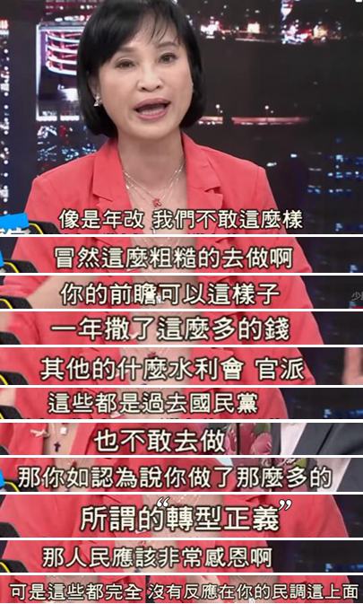 更反嗆蔡英文“你認(rèn)為做了很多所謂‘轉(zhuǎn)型正義’的事兒,那人民應(yīng)該非常感恩啊”,可惜并沒有體現(xiàn)在民調(diào)上!