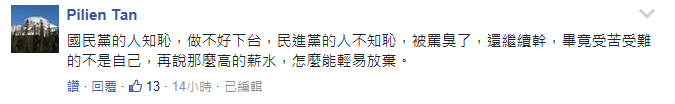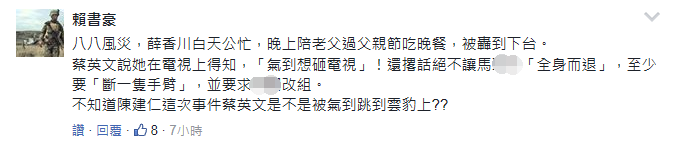 而以民進(jìn)黨一貫的作風(fēng),在出了事之后,也絕不會這么輕易認(rèn)輸投降。果不其然,就在昨天,陳建仁于臉譜網(wǎng)貼文致歉,還提到自己沒有防災(zāi)職權(quán),以求避免跟當(dāng)年薛香川同樣的下場。可惜的是,網(wǎng)友對此并不買賬,甚至紛紛吐槽“這種行徑很惡劣你知道嗎?”“以前罵別人罵得很過癮,現(xiàn)在是現(xiàn)世報!”