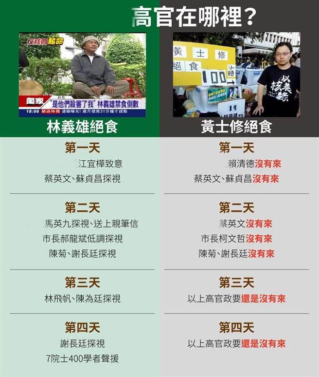 臺(tái)灣學(xué)者表示,看完這張圖才深深感受到“身份”的重要。這兩個(gè)人都為自己所相信的價(jià)值而絕食,但民進(jìn)黨這位只要表態(tài)一下,禁食幾個(gè)小時(shí),整個(gè)社會(huì)好像就沸騰起來(lái),然后無(wú)限神圣化他的訴求,比之為“圣人”。