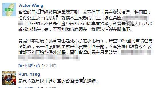 更有人表示“讓阿扁回監(jiān)已是人民共識,否則臺灣‘司法’蕩存”,但不少人則是哀嘆,由阿扁一人已可見證“臺灣‘司法’已死”、“臺灣‘司法’被民進黨玩弄到一文不值”;