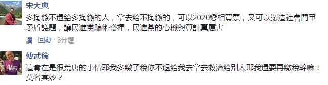 一名黃姓單親媽媽就抱怨,自己要扶養(yǎng)2個小孩,還租房子過生活,每天超時工作賺錢,去年繳了7萬多元的稅,結(jié)果自己申請不到補助就算了,如今竟然還要把多出來的稅收拿去給別人,“這是哪門子爛邏輯啊!”;還有網(wǎng)友炮轟這根本是“史上最大賄選!”