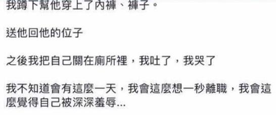 接著該男子又指著幫忙脫褲子的女空服員說(shuō)“幫我拉內(nèi)褲和褲子”,當(dāng)時(shí)腦筋空白的該空服員,渾渾噩噩的完成后便將他送回位置,接著就躲進(jìn)廁所哭泣、嘔吐,“不知道會(huì)有這么一天,這么想一秒離職”……
