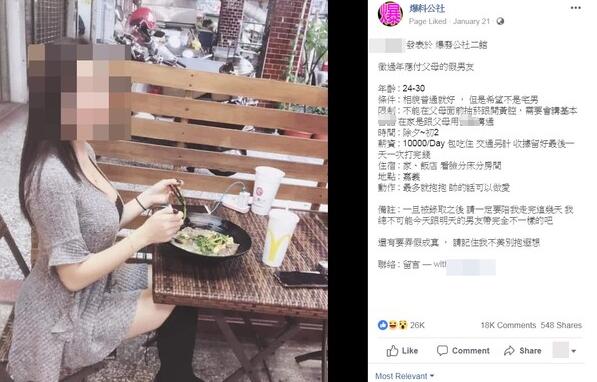 日前島內(nèi)臉譜網(wǎng)的爆系社團(tuán)以及“靠北虎科”、“靠北清大”等版面都出現(xiàn)大量類似的征友文,內(nèi)容提到“征過(guò)年應(yīng)付父母的假男友”,條件包含24-30歲,相貌普通就好,在除夕到初二期間陪征友回家,一天可領(lǐng)1萬(wàn)元還包吃住……其中最特別的是:要不要一起睡需“看臉”,動(dòng)作“最多抱抱”,但如果“帥的話可以愛愛”。