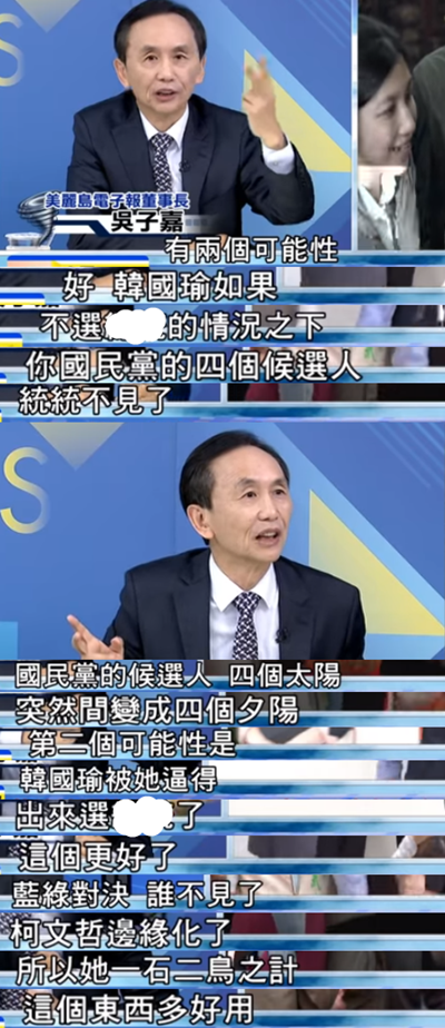 資深媒體人吳子嘉進(jìn)行了一番深入解讀。蔡英文打韓國瑜原來是個一石二鳥之計。如果韓國瑜不選2020,那么蔡英文打韓則會將國民黨“太陽們”“掃進(jìn)垃圾桶”;如果韓國瑜參選,則選舉將回歸“藍(lán)綠對決”,主打白色力量的柯文哲就會被邊緣化。