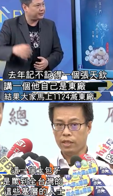 媒體人謝寒冰在節(jié)目中表示,去年“九合一”選舉,民進黨當局出了個“東廠廠公”張?zhí)鞖J,今天出了個黃重諺,一句話幾乎罵遍了臺灣所有基層人士。張?zhí)鞖J也算有了接班人。