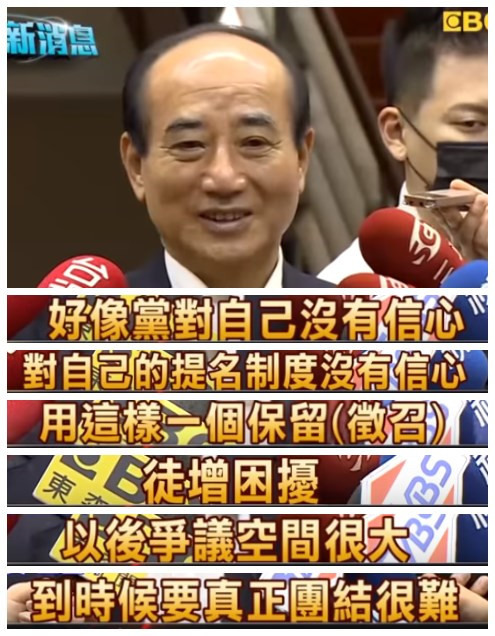 對于保留征召的作法,王金平在接受專訪時表達了強烈的質(zhì)疑,王金平并直言,若初選后再征召,一定衍生很大的爭議并造成很多變量,“如果有人要往這方向沖,黨不會真正團結(jié)”。