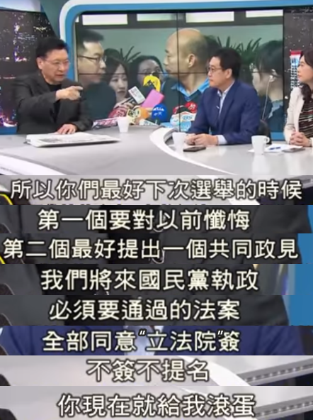 該說(shuō)不說(shuō),費(fèi)鴻泰這個(gè)論斷還真是不容易反駁~所以節(jié)目中,資深媒體人趙少康提議,國(guó)民黨應(yīng)該“懺悔”,臺(tái)灣老百姓曾經(jīng)給過(guò)你們機(jī)會(huì),到最后卻什么都通過(guò)不了。