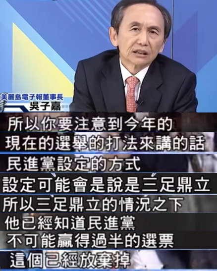 前一陣子,因?yàn)槊土遗谵Z蔡英文和陳菊施政而被開除民進(jìn)黨黨籍的吳子嘉在政論節(jié)目中分析,民進(jìn)黨對(duì)2020選舉的設(shè)定是“三足鼎立”,哪三足呢?國民黨、民進(jìn)黨以及柯文哲。