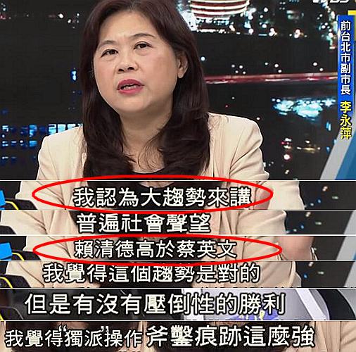 前臺(tái)北市副市長(zhǎng)李永萍則認(rèn)為,從大趨勢(shì)而言,賴清德的社會(huì)聲望高于蔡英文,這點(diǎn)沒(méi)問(wèn)題,但如此“壓倒性的勝利”,只能說(shuō)是“獨(dú)派”操作的痕跡太重,這于民進(jìn)黨的選情不是件好事。