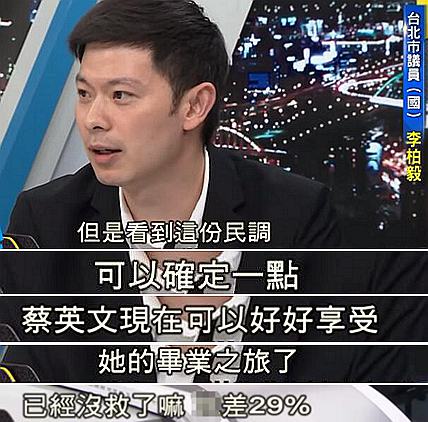 “可以確定的是,蔡英文可以好好享受她的‘畢業(yè)之旅’了”,臺(tái)北市議員李柏毅順便為正忙著訪“友邦”的蔡英文作了總結(jié),“已經(jīng)沒(méi)救了嘛”~這哥們兒還特逗的暗諷該基金會(huì)的民調(diào)數(shù)字“沒(méi)有想好”:29%哪是蔡英文狂輸給賴清德的,分明是對(duì)民進(jìn)黨執(zhí)政3年來(lái)政績(jī)的否定嘛!
