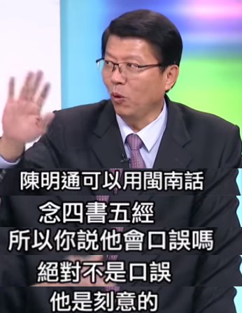 前臺(tái)南議員謝龍介表示,陳明通可是能用閩南語講四書五經(jīng)的人,他是不會(huì)口誤的,說出這樣的話,顯然是刻意為之。
